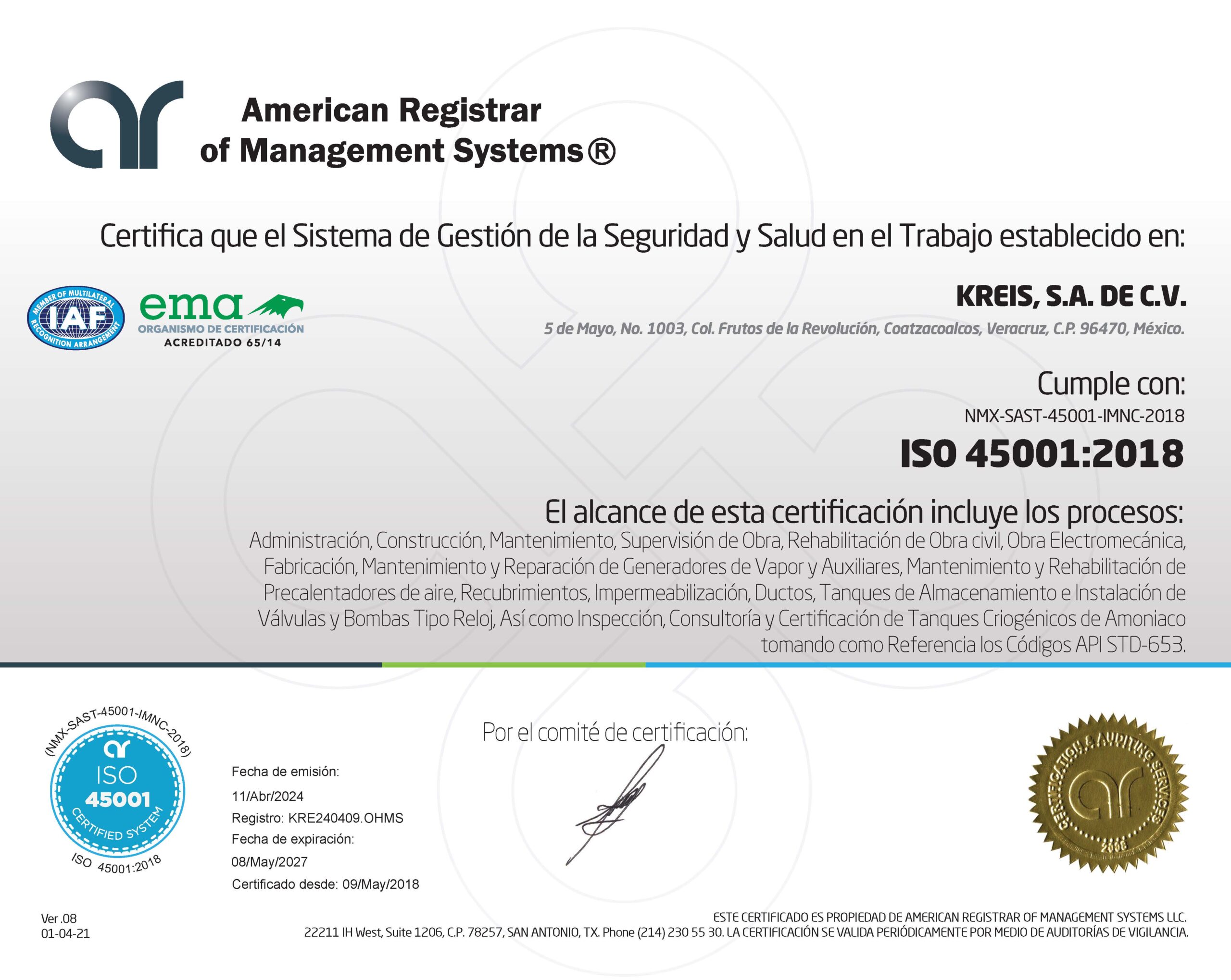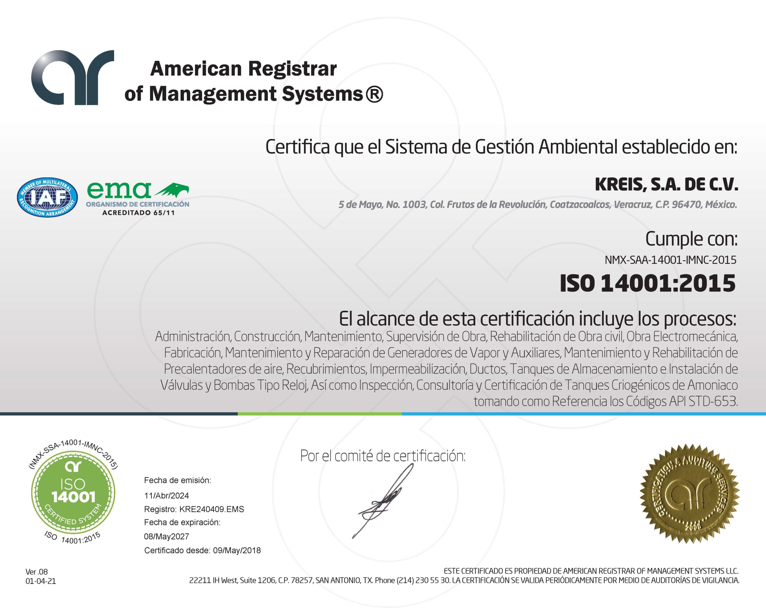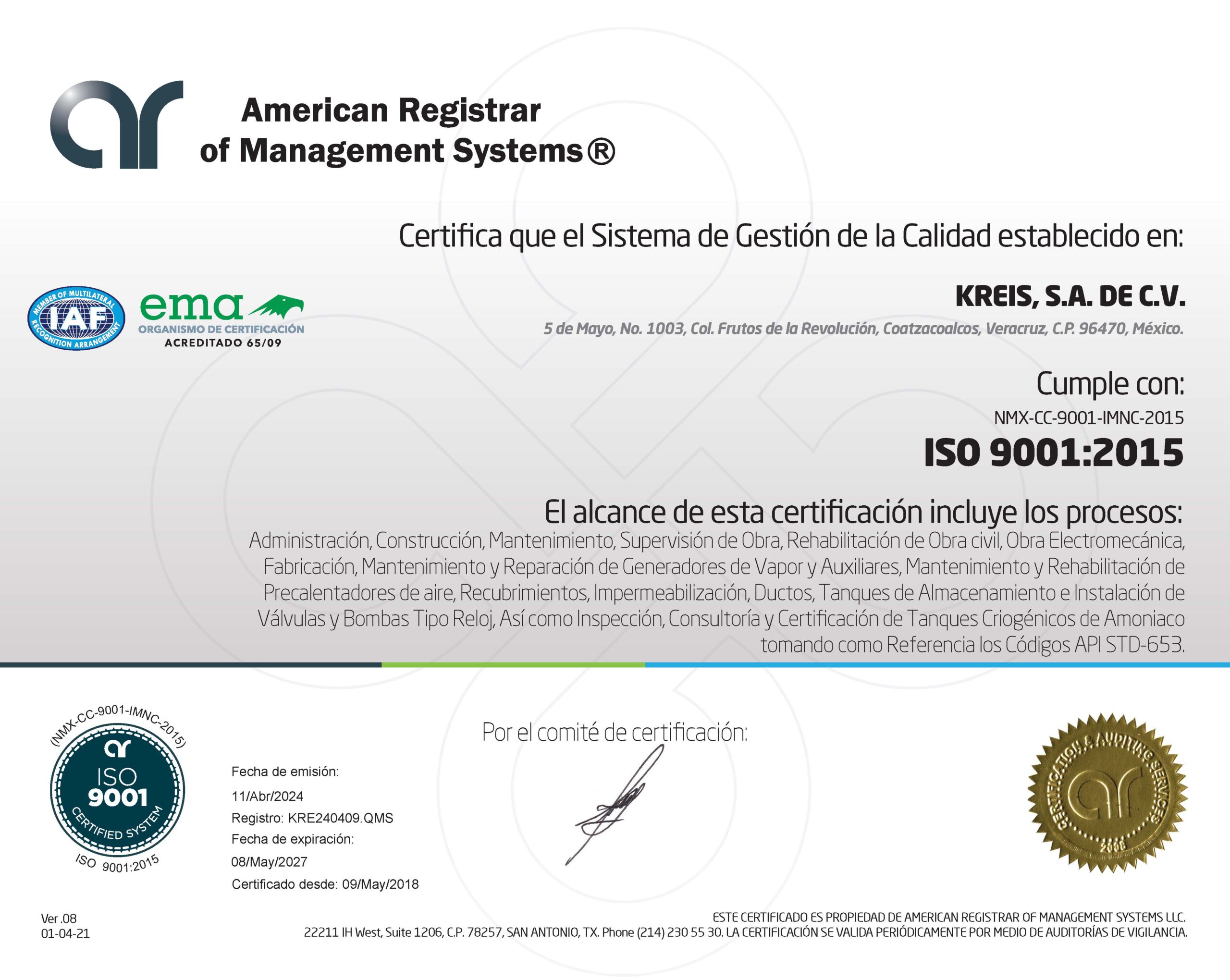 En KREIS S.A. de C.V., operamos bajo estrictos estándares de calidad, seguridad y gestión ambiental, respaldados por certificaciones ISO y ASME. Estas acreditaciones garantizan la excelencia en nuestros procesos, así como nuestra capacidad para la fabricación, reparación y mantenimiento de equipos especializados. Nos enfocamos en la mejora continua para ofrecer soluciones eficientes y confiables a nuestros clientes.